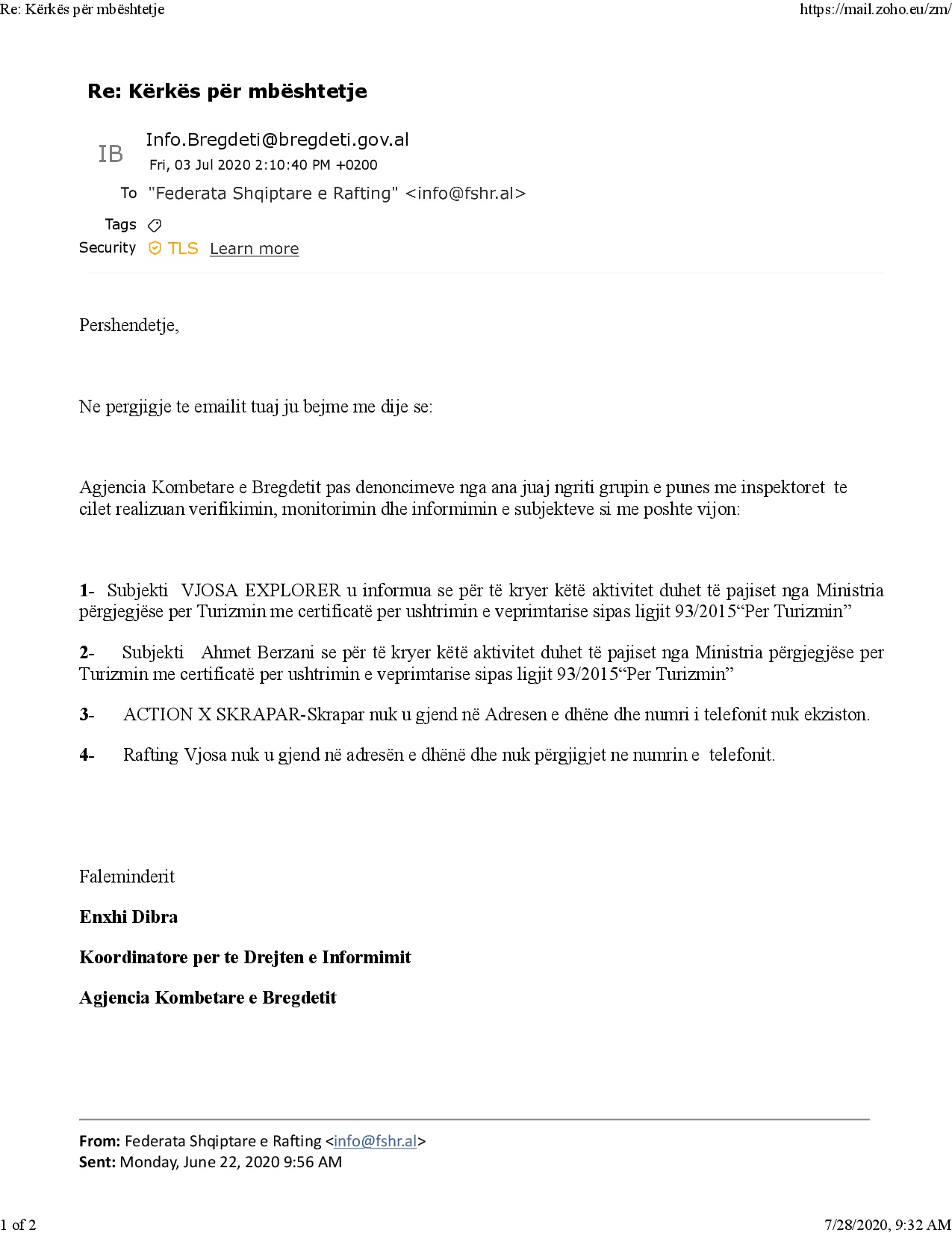 Subjekte si: “VJOSA EXPLORER”, “AHMET BERZANI PF”, “RAFTING VJOSA”, “ACTION X SKRAPAR” nuk kane guida te trajnuara dhe si rrjedhoj nuk janë pajisur nga Ministria përgjegjëse per Turizmin me certificatë per ushtrimin e veprimtarise sipas ligjit 93/2015“Per Turizmin”, gjë të cilën ju është komunikuar dhe nga Agjencia Kombetare e Bregdetit. (Ne attach dokumenti njoftimit)