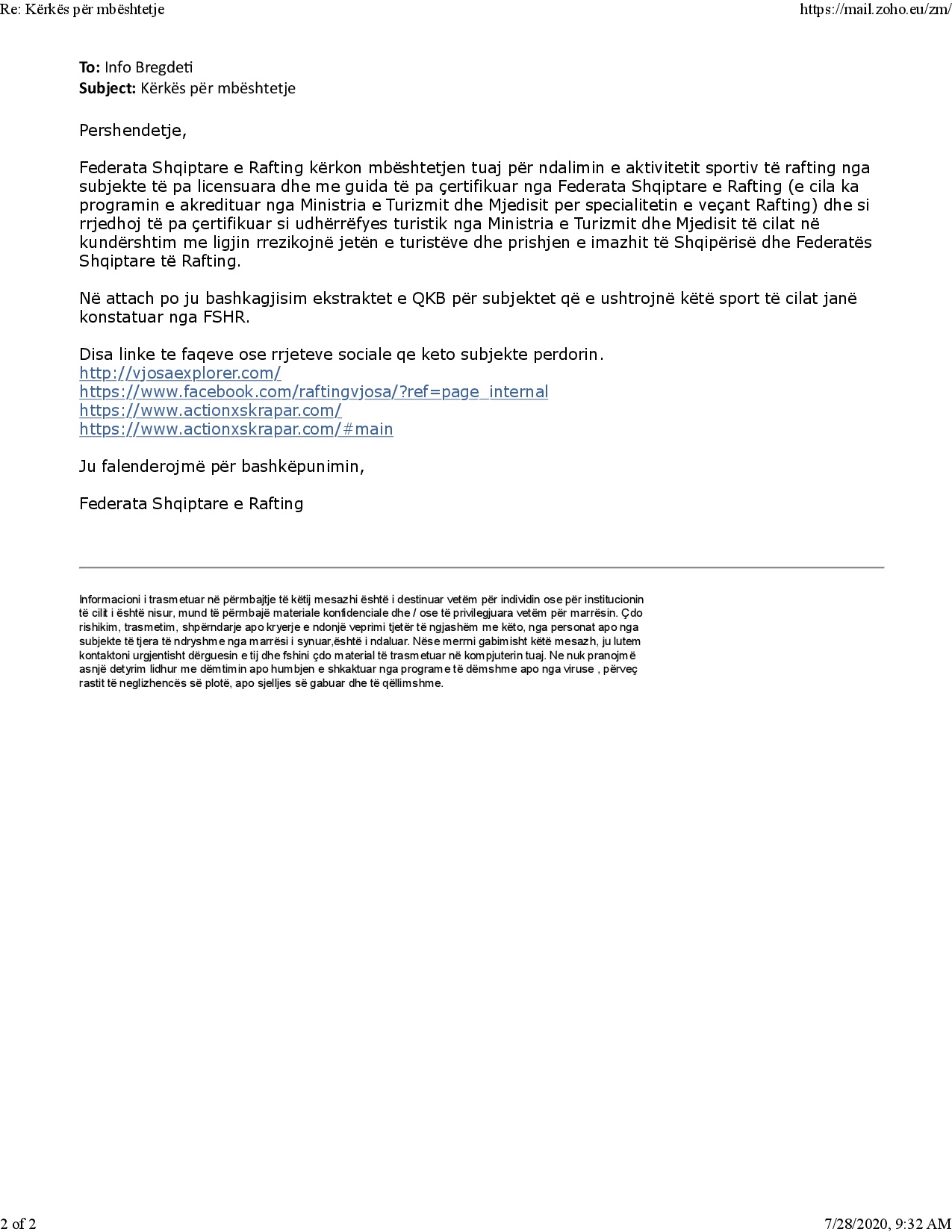 I bëjm thirrje institucioneve përkatëse të marrin masa ndaj subjekteve të cilat ofrojn aktivitetin e rafting si një aktivitet ekonomik duke mos respektuar asnje standart dhe vënë në rrezik jetën e turisteve dhe demtojnë imazhin e Shqipërisë.