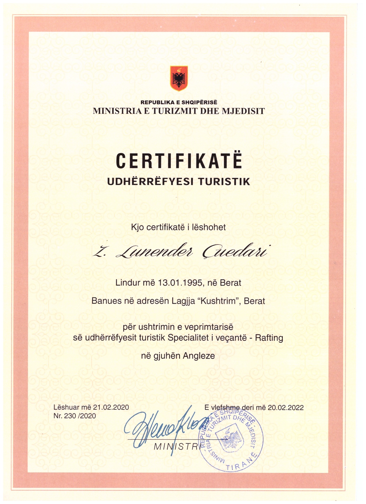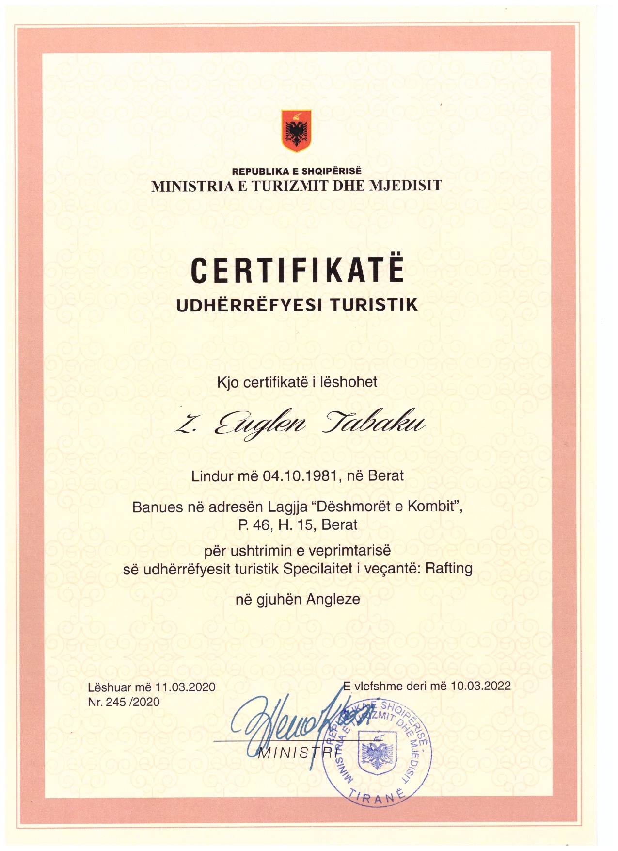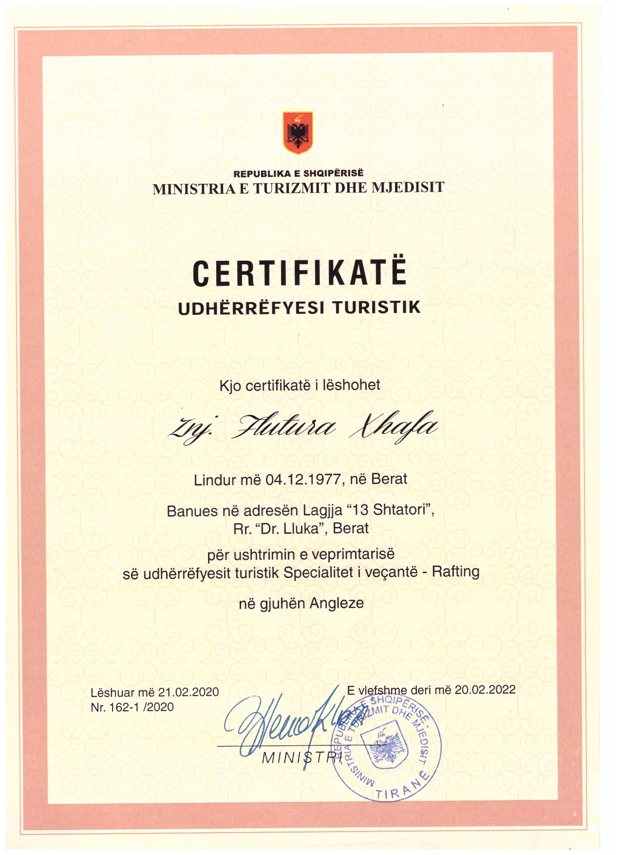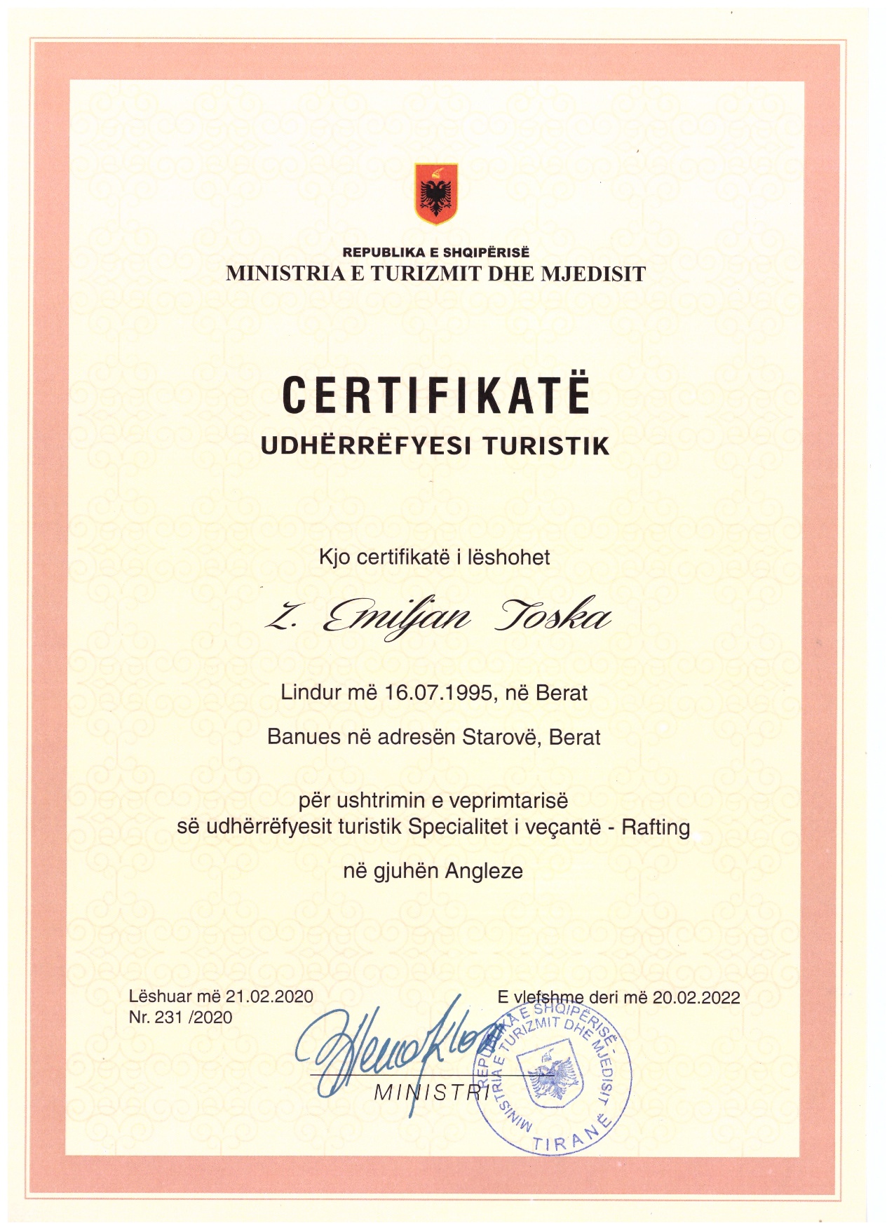Coach & GuideCertified rafting guide from the Albanian Rafting Federation and the Ministry of Tourism and Environment.